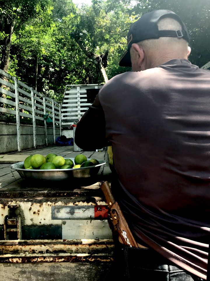 AUTODESCRIÇÃO: vemos um homem de costas na traseira de um caminhão: ele usando uma camisa UV escura e um boné preto. Tem uma faca na bainha enganchada na sua calça. No caminhão vemos uma bacia de alumínio com limões. Ao fundo árvores frondosas.