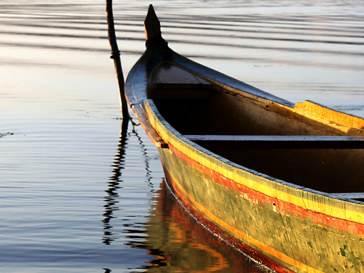AUTODESCRIÇÃO: vemos um barco amarelo com faixas nas laterais em vermelho e laranja, e azuis na proa e nos bancos. O barco está amarrado a uma estaca em águas calmas, espelhadas e com leves marolas.