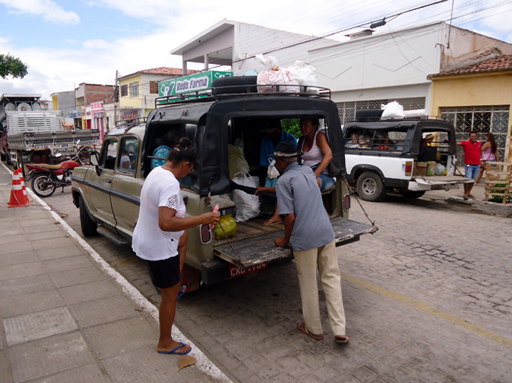 caminhonete para o transporte de pessoas: é comum o uso de caminhonetes e caminhões adaptados para o transporte entre os sítios e a cidade, no sertão de Alagoas. Esse transporte atende o transporte para as feiras, para o transporte escolar e para o transporte de pequenas compras, como sacos de ração e animais. Praça central de Pão de Açúcar, AL