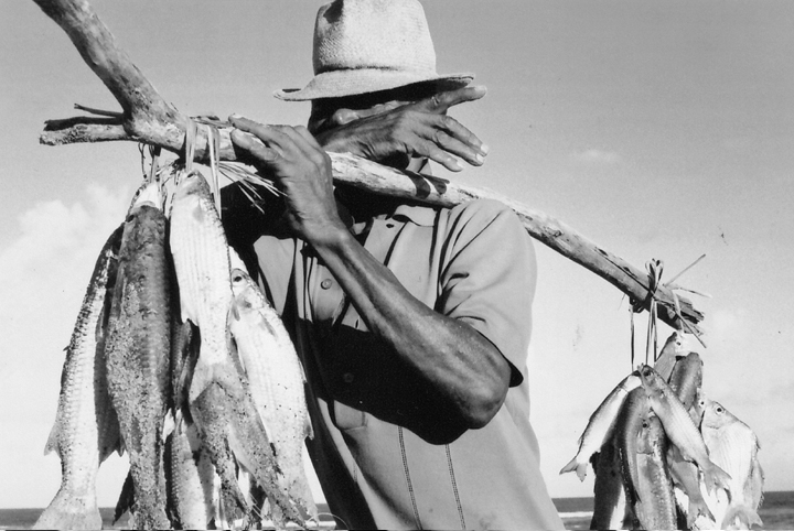 pescador carregando peixes, amarrados em corda e apoiado nos ombros. Praia do Francês, Marechal Deodoro, AL