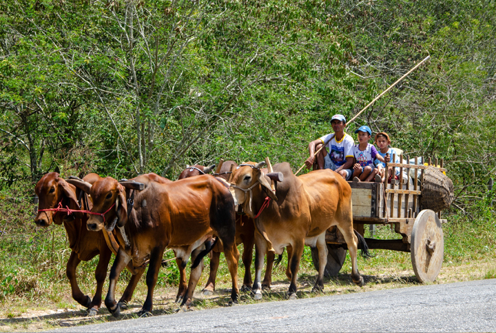 AUTODESCRIÇÃO: vemos um carro de boi, com duas pareias de bois marrom escuro, andando na margem de uma rodovia asfaltada. Observamos três pessoas sentadas em cima do carro. O primeiro é um homem de boné azul, camisa branca e uma vara comprida apoiada no ombro. Ao lado dele, duas crianças usam branco e uma veste um boné azul. Vemos também um cesto de cipó trançado pendurado do lado de fora do carro. Ao fundo, há uma vegetação alta e esverdeada.