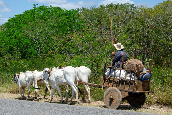 AUTODESCRIÇÃO: vemos um carro de boi, com duas pareias de bois zebus brancos. Um homem de chapéu e short branco, camisa azul, está sentado no carro e segura uma vara comprida na mão. Estão andando na margem da rodovia asfaltada levando uma carga com sacos brancos, um cesto de cipó trançado e um cocho feito de reutilização de bombona azul. Ao fundo observamos uma vegetação esverdeada.