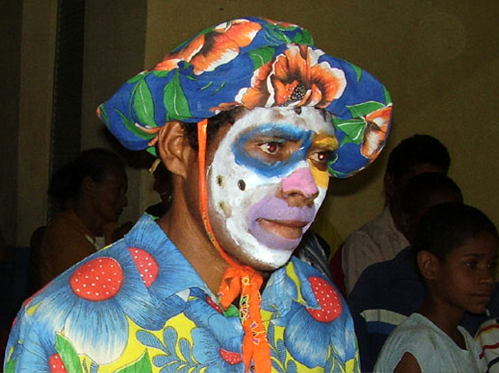 AUTODESCRIÇÃO: vemos um rapaz com olhar sereno com o rosto maquiado com tinta branca e bolinhas pretas, cores azuis e laranja ao redor dos olhos e roxo ao redor da boca. Ao redor do nariz, rosa. Ele usa um chapéu combinando com o tecido estampado de flores em tons avermelhados sob fundo azul usado na sua blusa. Atrás dele, algumas pessoas.