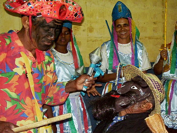 AUTODESCRIÇÃO: vemos uma cena de folguedo com dois personagens caracterizados no primeiro plano e no segundo plano, algumas mulheres vestindo chapéus e vestidos de seda azul clara com fetilhos nas cores vermelho, branco verde e roxo. Os chapéus também são em azul escuro e com os mesmos fetilhos e adornados com um espelho oval na parte frontal. Uma delas está levantando uma espada de madeira amarela em uma das mãos. Um dos personagens usa um chapéu em tons de vermelho com pedras brilhantes combinando com o tecido estampado de flores em tons avermelhados usado na sua blusa. O outro usa uma máscara com uma barba e pintada em tons de marrom e preto, com detalhe vermelho na boca e branco ao redor dos olhos. Usa também um chapéu de palha.