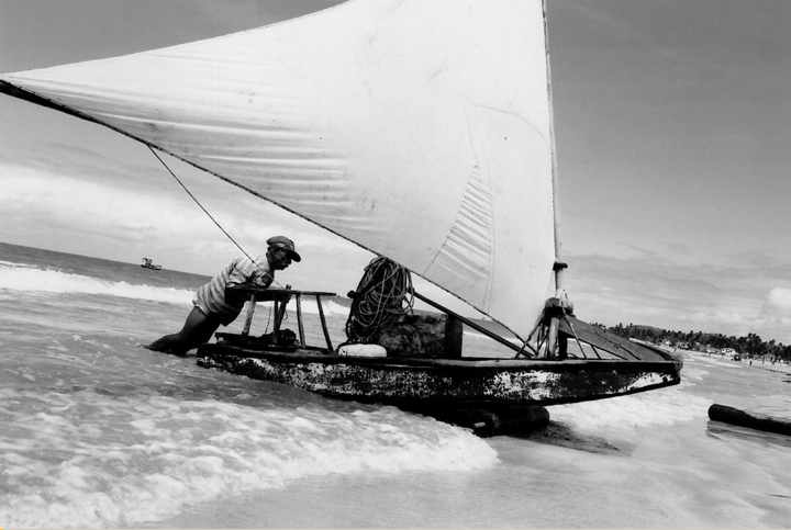 AUTODESCRIÇÃO: vemos uma foto em preto e branco onde um homem empurra sua jangada para fora do mar. Ele usa um shorts e uma camiseta listada e um boné escura. Sua jangada está com a vela inflada ao vento e vemos um rolete debaixo da jangada que serve de apoio para empurrá-la para a areia. Ao fundo e ao longe, coqueiros.