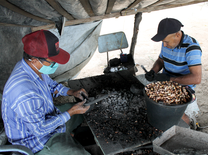 AUTODESCRIÇÃO: vemos duas pessoas sentadas quebrando a casca das castanhas de caju com a ajuda de um mini porrete de madeira. Elas estão sentadas em uma mesa, um de frente ao outro e vemos uma pilha de castanhas torradas em cima da mesa e um balde preto plástico com as castanhas já sem casca. À esquerda o homem veste uma camisa de manga azul claro com listas verticais brancas e de outros tons azuis. Ele usa um boné vermelho, óculos preto e uma máscara antigripal azul. Do outro lado o homem usa uma camisa pólo azul com listas horizontais pretas e brancas. Também usa um boné e luvas pretas. Entre eles, uma cadeira e sobre ela um rádio de pilhas. Eles estão em baixo de uma lona plástica preta.